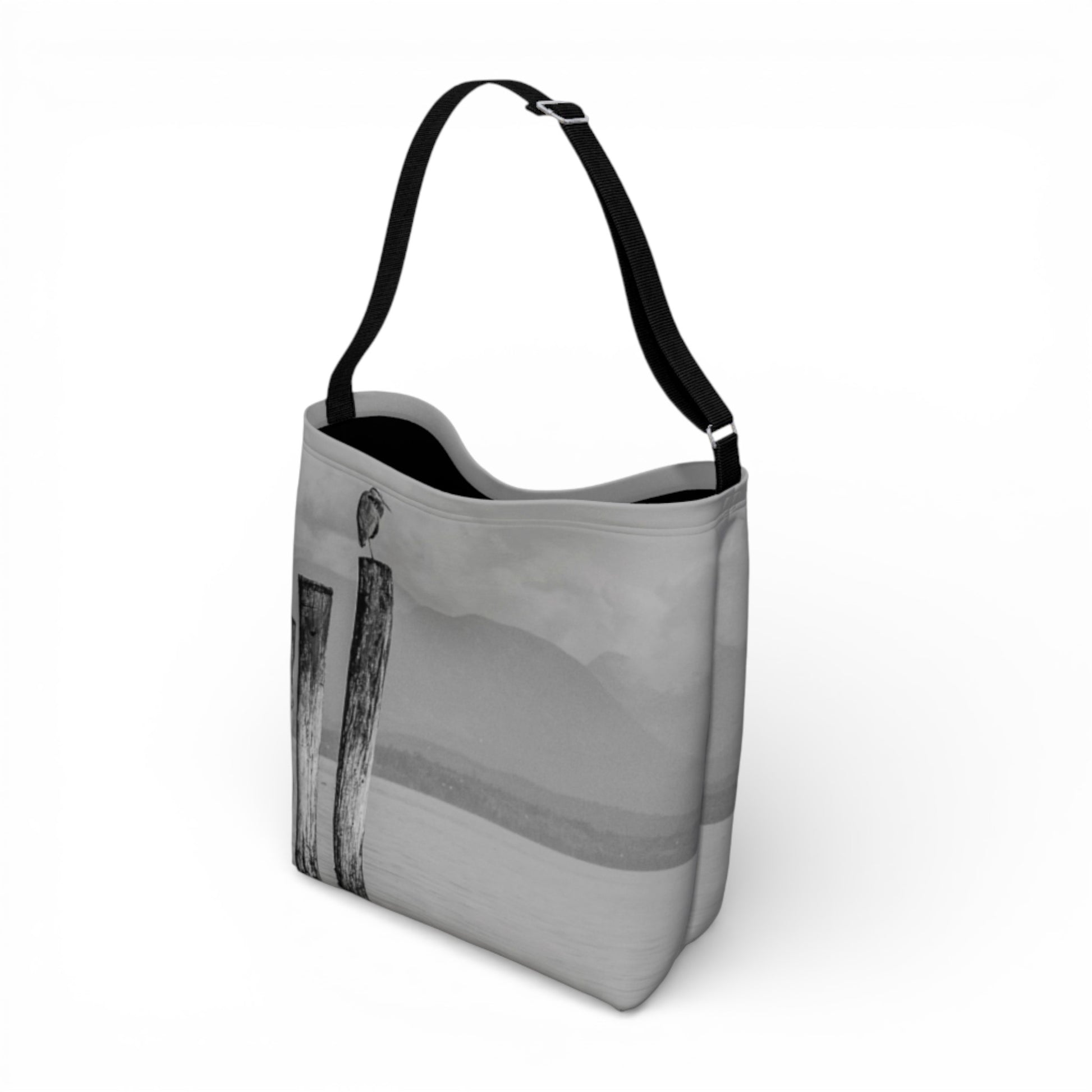 The exterior showcases a captivating image of a blue heron perched atop a vertically standing log in the ocean water, while the interior features a classic black hue – adding a touch of sophistication to this eye-catching tote.