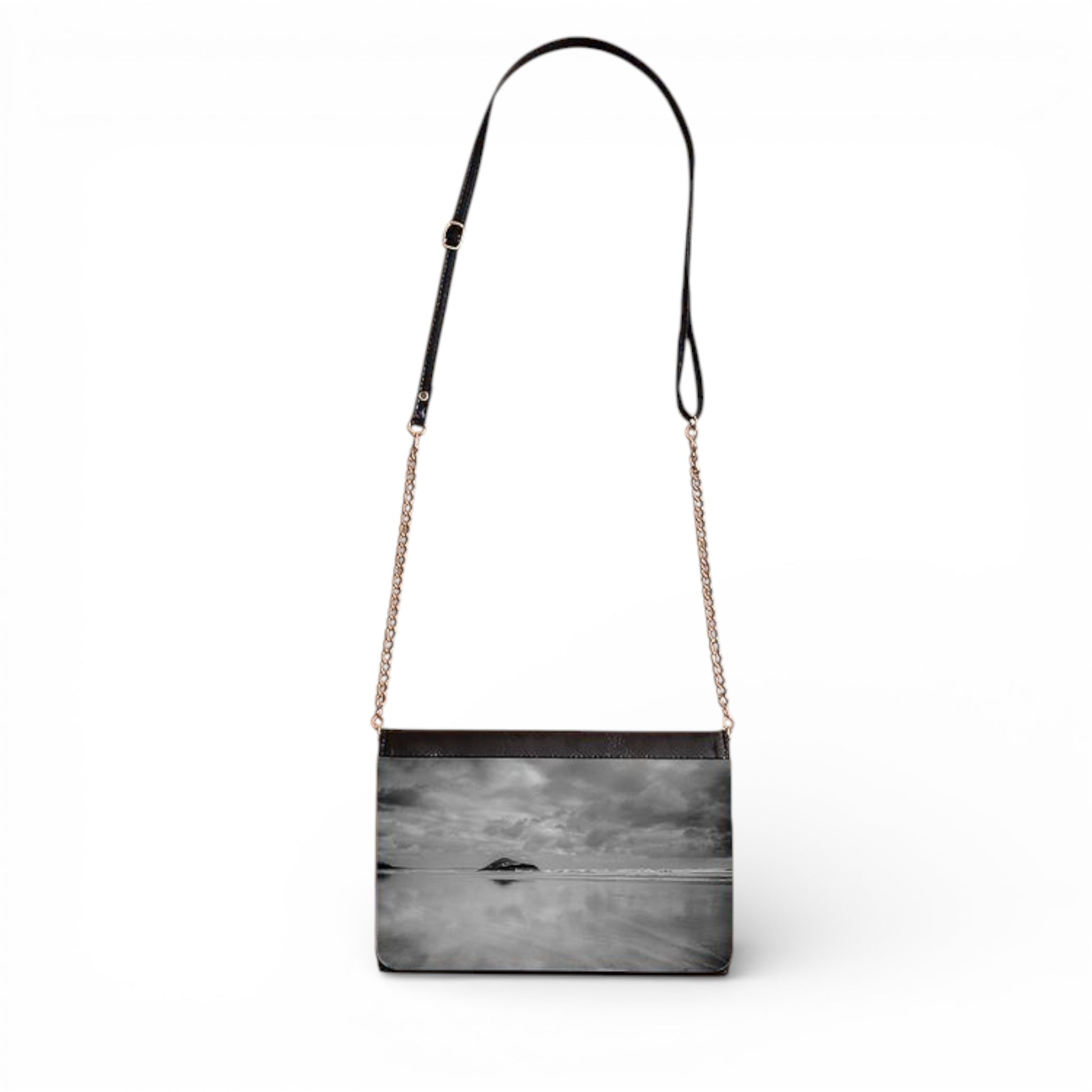 • Removable strap blending an elegant chain with black vegan leather