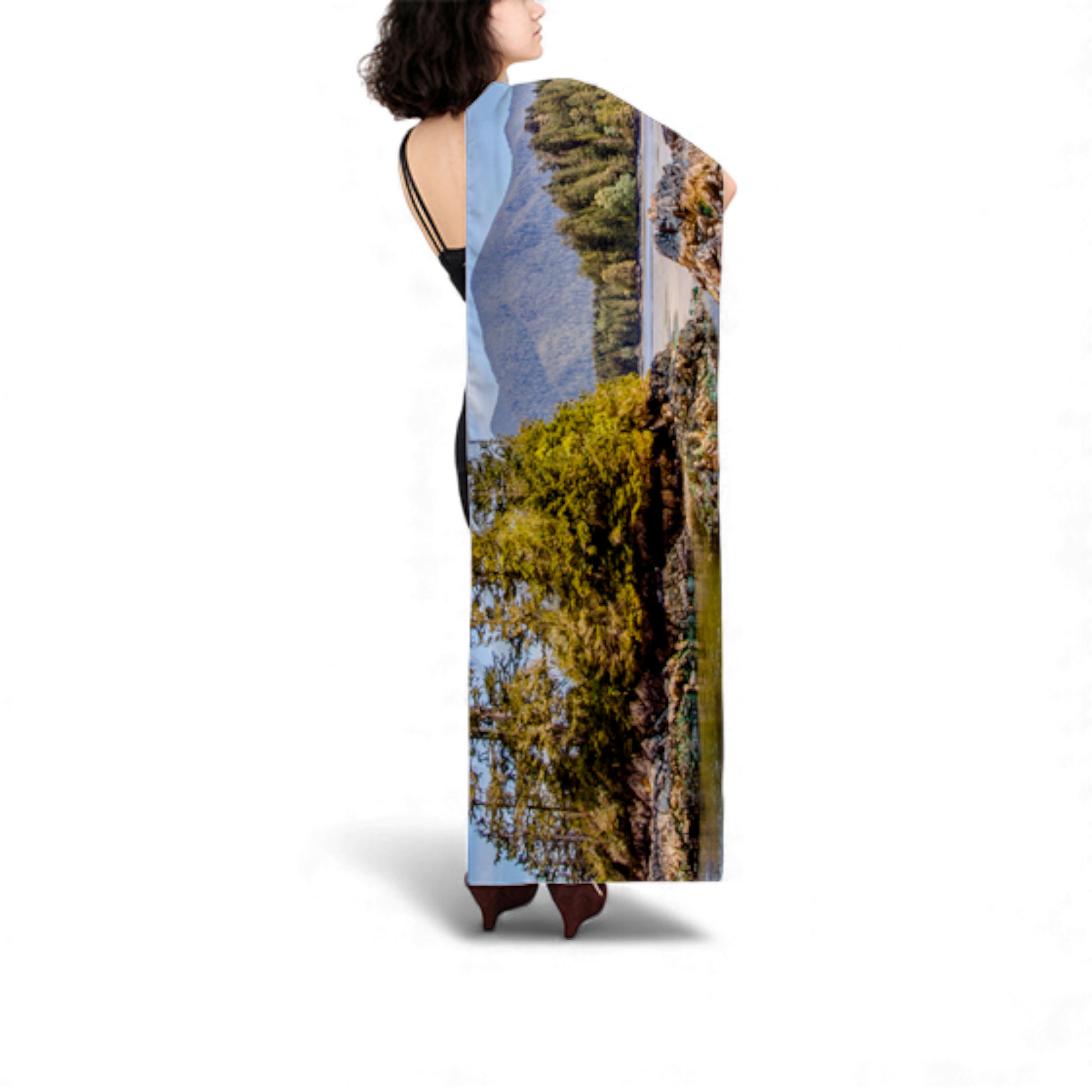 Wear this Tofino Inlet long scarf as a stylish accessory, wrap it around your head, or display it as a unique wall hanging for your home.