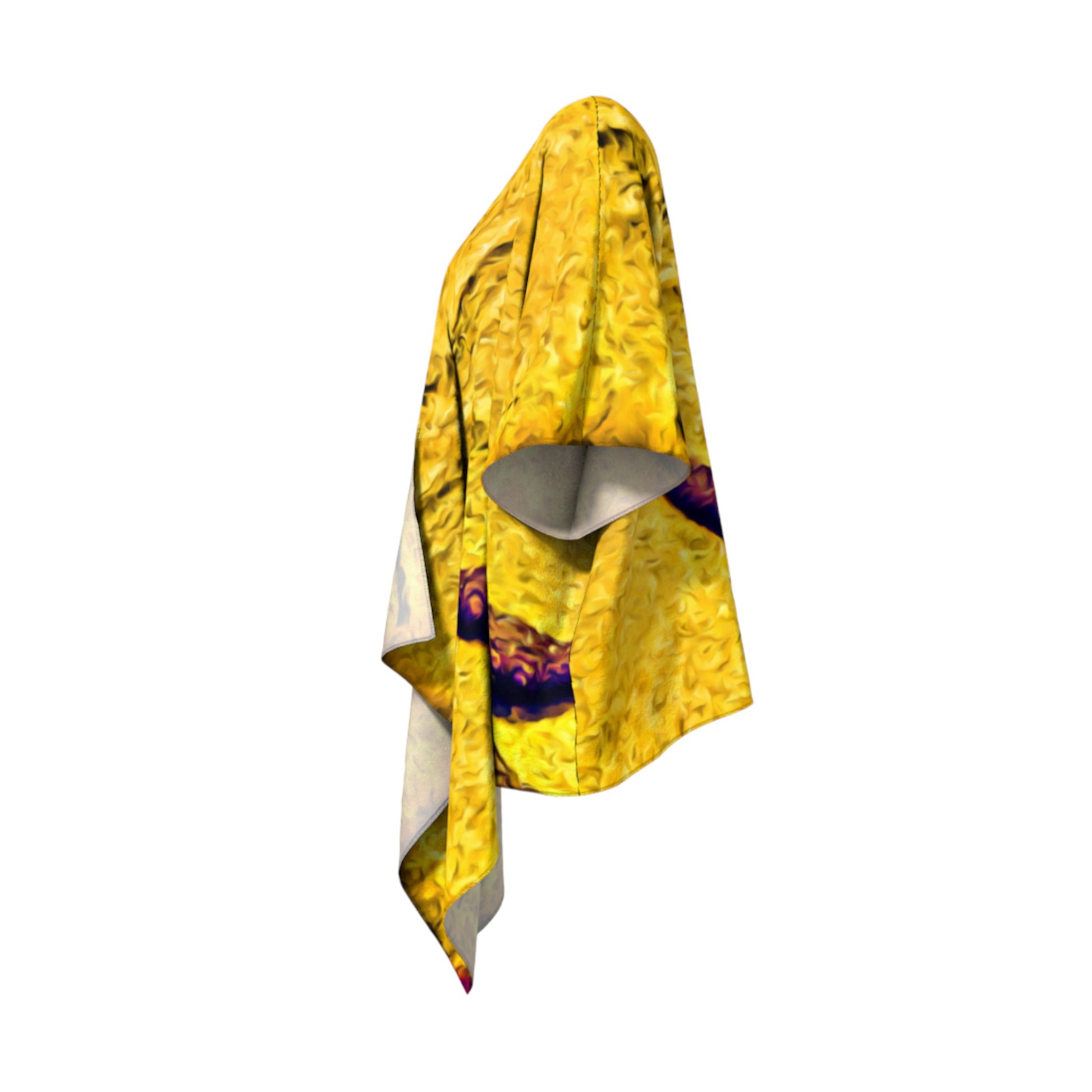 Indulge in luxury and artistry with our Van Isle Goddess Draped Kimono, available in chiffon, silky knit, or luxurious silk. Personalize it with a white or black fringe for a touch of glamour.